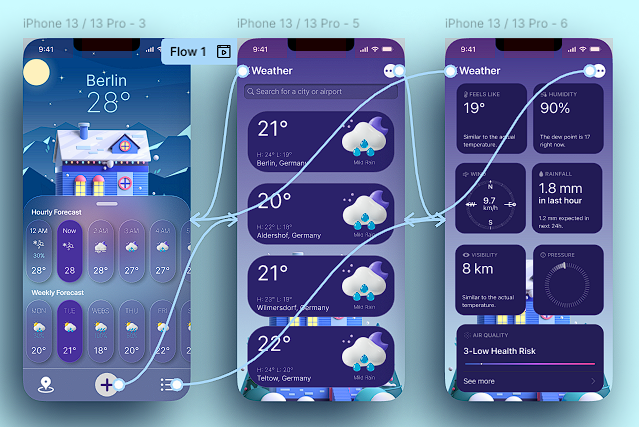 Simple Prototype Path: I created a straightforward prototype path to ensure the app was intuitive and easy to use. By focusing on a clean navigation system with clearly defined steps from the home screen to the hourly and daily forecasts, users could seamlessly transition between sections of the app without confusion. The goal was to keep the user journey simple and direct, minimizing any unnecessary interactions or distractions.