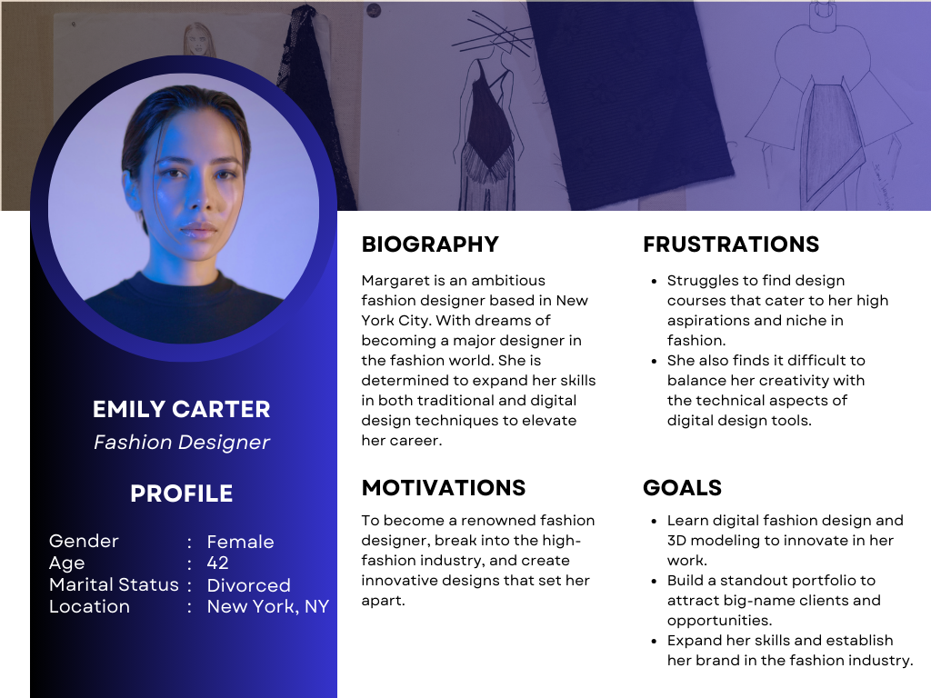 Emily: A 42-year-old fashion designer who owns her own boutique and wants to enhance her skills in digital fashion illustration and trend forecasting. Emily balances a busy schedule between running her business and staying creatively inspired. She requires courses that integrate into her routine, offering flexibility and practical insights she can immediately apply to her designs. Transparency in pricing and content is vital for Emily, as she prefers to make well-informed decisions.