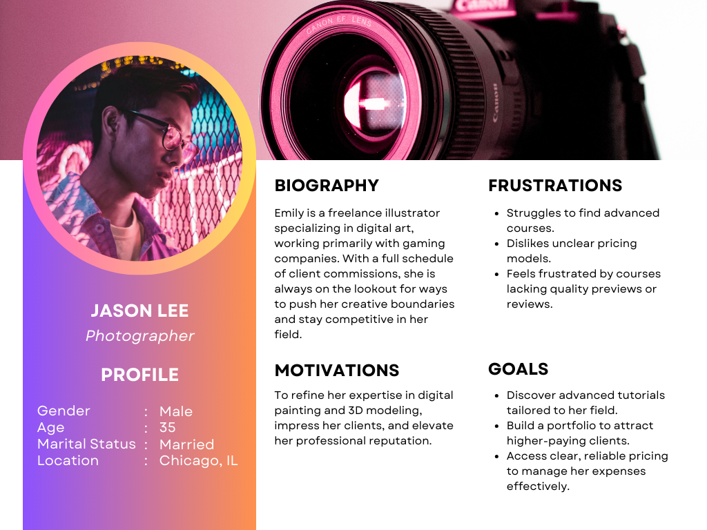 Jason: A 35-year-old photographer with over a decade of experience, Jason is ready to expand his skillset into videography and advanced editing techniques. Confident in his expertise, he seeks professional-grade courses that keep him updated on the latest trends in creative technology. Jason values a polished, professional platform that provides seamless navigation and ensures every minute he spends is productive.