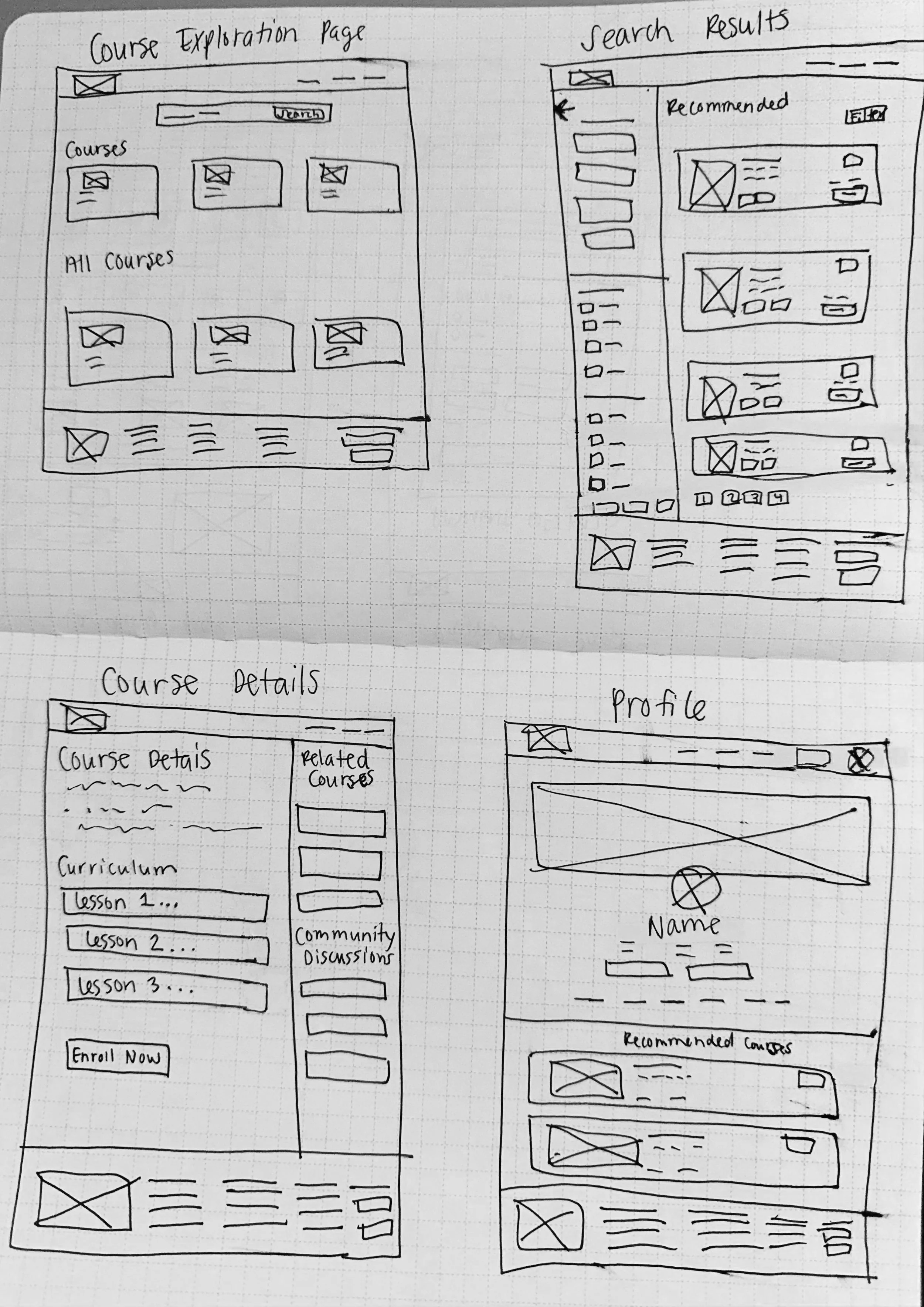 With the personas and user flow established, I began sketching early wireframes to visualize the platform's structure and key interactions. These initial sketches emphasized simplicity, balancing aesthetic appeal with functionality. Early tests revealed opportunities to enhance usability, such as simplifying the subscription process and improving the visibility of course details.