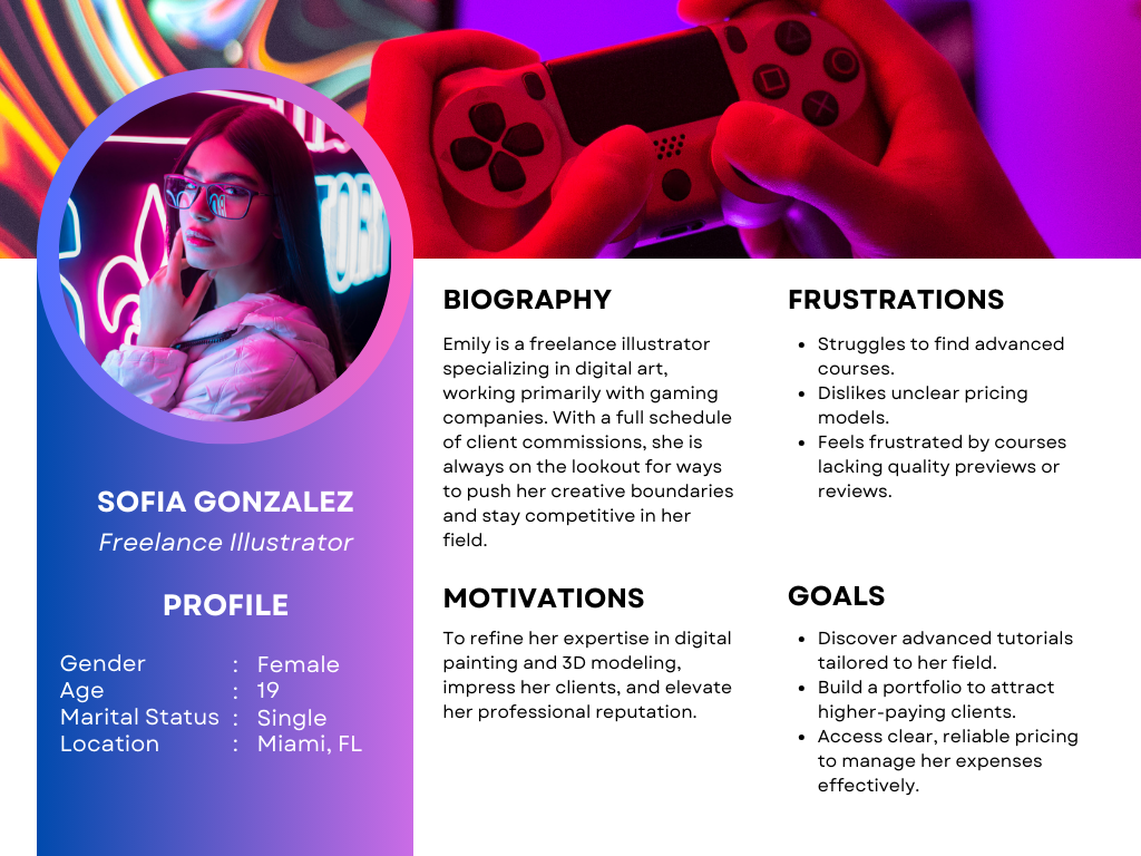 Sofia: A 19-year-old freelance illustrator working with gaming companies. As a rising professional in a competitive industry, Sofia is eager to learn advanced illustration techniques and master storytelling. She needs a platform that offers cutting-edge, specialized courses without being overwhelming. For Sofia, affordability and clarity in course content and instructor credentials are crucial, as she wants to invest her limited time and budget wisely.