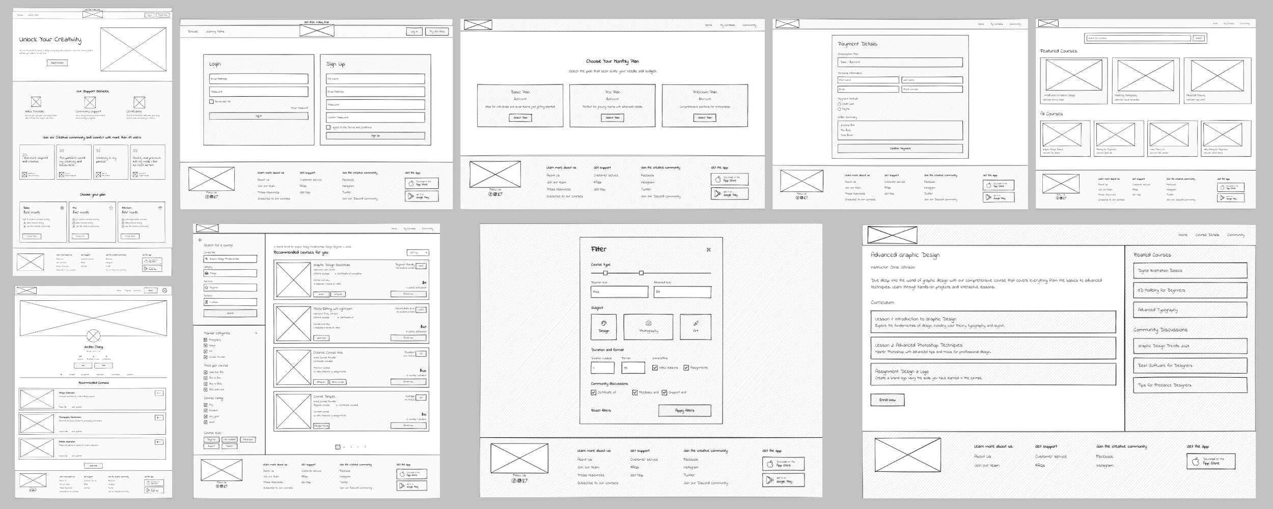 Our refined Creativio wireframe focused on enhancing the user experience by making key course information more accessible and visually appealing. We simplified the layout to ensure that course details were easy to read and navigate, using clear typography and intuitive icons to highlight key features. Calls-to-action were strategically placed to guide users smoothly through the course discovery process, and we ensured that pricing and plan options were displayed transparently for better decision-making. This design addresses the needs of creative professionals like Emily, Jason, and Sofia, offering a more seamless, engaging experience that aligns with their goals. With the wireframe finalized, the next step is: